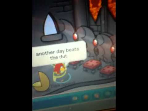 Ok, here we go! "How did they get in here!" (Pure, Sunburn, and Cynder are dancing around detonator) "KLUTZY! Stop them!" (Klutzy runs to puffles and detonator and then dances with puffles) "EVERYBODY STOP!" (Puffles and Klutzy stop and Sunburn has detonator half in mouth, lol, and Herbert grabs detonator and Herbert moves detonator around and puffles and Klutzy follow it and lightbulb flashes in Herbert's head) "Follow the light or the little detonator" (Herbert moves backward and Pure, Cynder, Sunburn, and Klutzy follow and Herbert opens door and gasps and his eyes turn to puffles, not literately, and millions of puffles fall in and Herbert loses detonator) "Where is it where is it?" (Herbert picks up white puffle and it kisses his nose, lol, and he screams on throws it into the air, and a group of puffles move, and white puffle lands on flashing detonator, lol) "NOOOOOOOO!" (Sticky soda bomb explodes and everyone and everything is covered in soda, lol, and Herbert picks up Klutzy by neck and Klutzy holds out detonator and detonator beeps and flashes again and all puffles start dancing) Thats it people! Now, here is the link: http://www.youtube.com/watch?v=0QfBVC4l-bg. There you go! Bye!